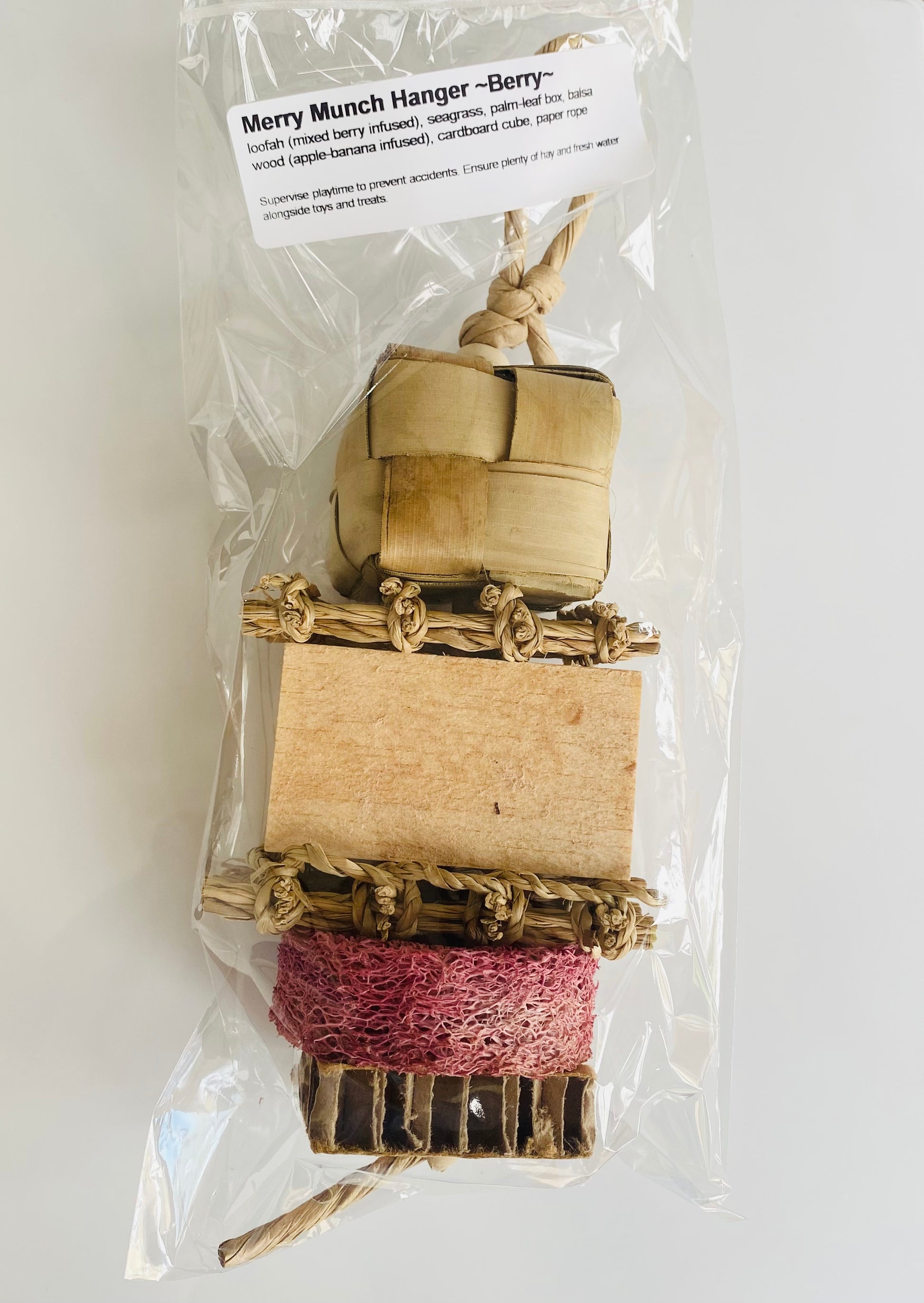 The loofah is infused with mixed berry, while the large balsa wood block is infused with appleābanana for extra chewing excitement.