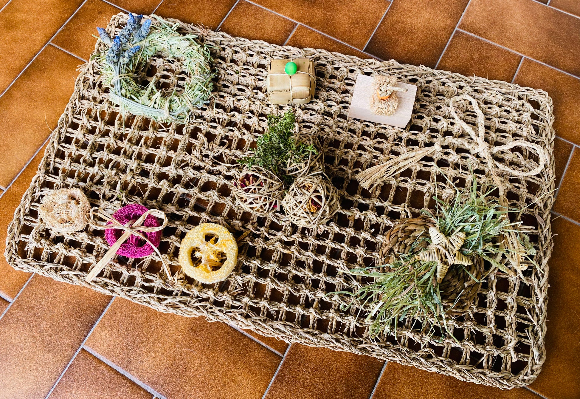 seagrass, raffia, sisal twine, vine ball, rose petals, carrot tops, timothy hay, vine star (fruit-infused), palm leaf box, balsa wood (fruit-infused), loofah (fruit-infused), lavender, wooden ball